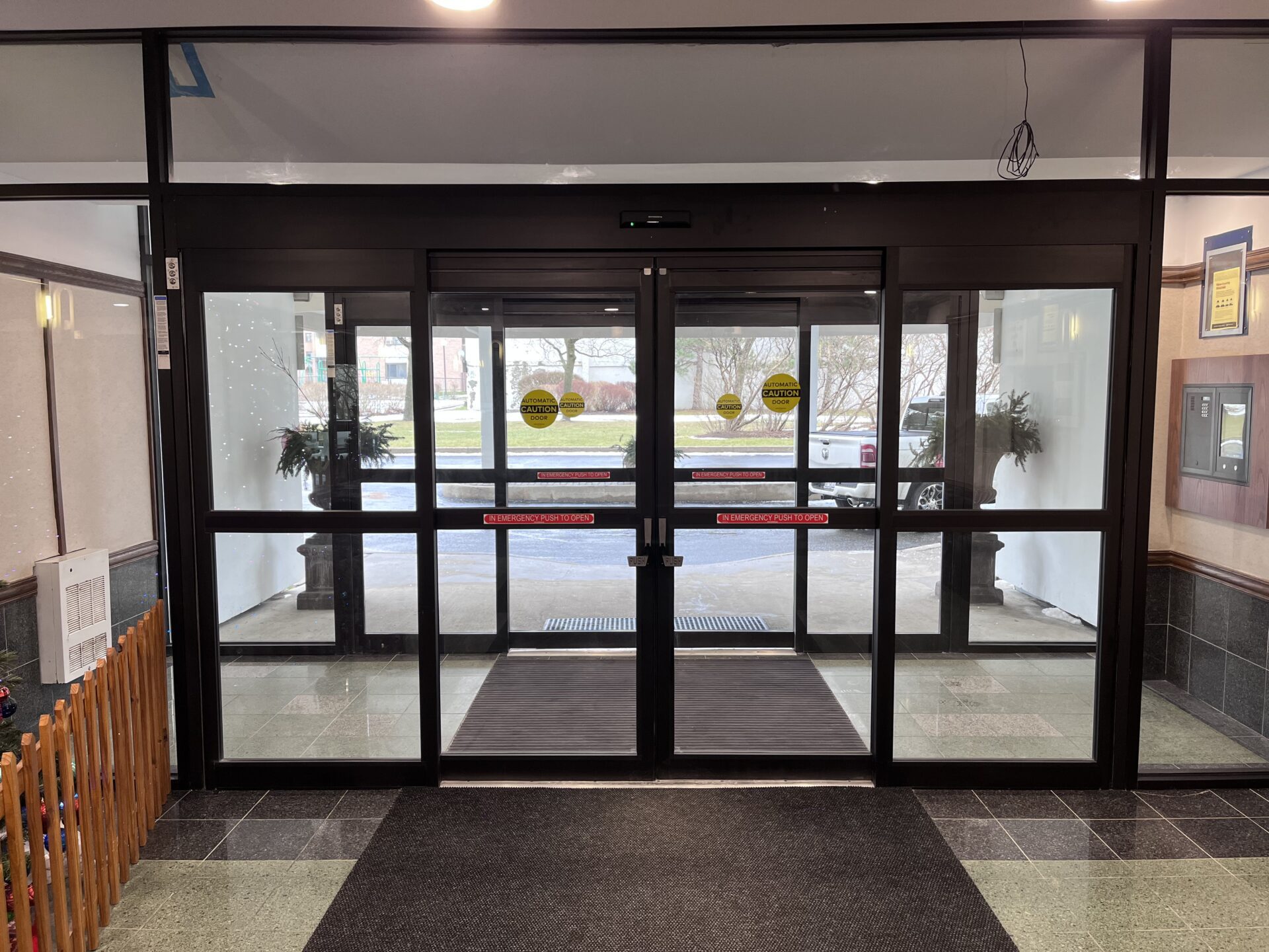 ESA400 Fine Frame automatic sliding door. Elegant and upscale; perfect marriage of beauty and functionality. Recommended for standard openings for office and apartment building applications. Full breakout provides enhanced egress capacity.